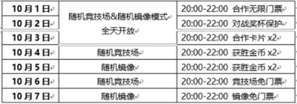 国庆假日连续7天轮换活动大狂欢,每日20:00-22:00限时开放。